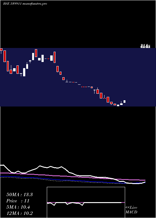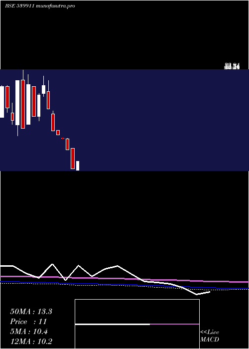 | DMA period | DMA value | | 5 day DMA | 10.36 | | 12 day DMA | 9.71 | | 20 day DMA | 10.01 | | 35 day DMA | 11.44 | | 50 day DMA | 13.14 | | 100 day DMA | 18.9 | | 150 day DMA | 21.23 | | 200 day DMA | 21.85 | EMA (exponential moving average) of Snim 539911
