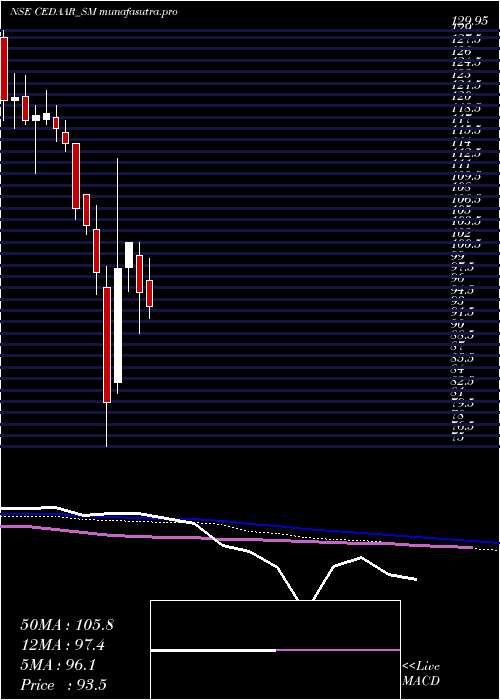 | DMA period | DMA value | | 5 day DMA | 96.37 | | 12 day DMA | 99.49 | | 20 day DMA | 96.31 | | 35 day DMA | 100.84 | | 50 day DMA | 105.91 | | 100 day DMA | | | 150 day DMA | | | 200 day DMA | | EMA (exponential moving average) of Cedaar Textile CEDAAR_SM
